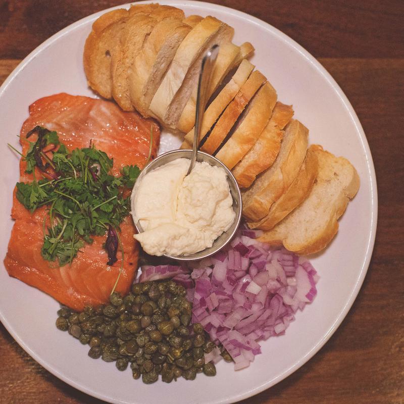 Toast, house mustard, capers, red onion, and pea shoots.